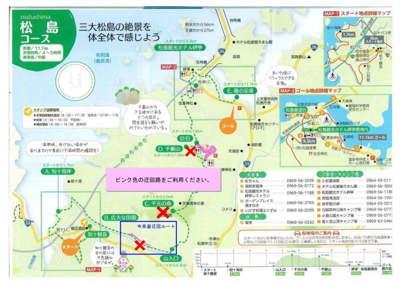 また、駐車場➡スタート地点までは約5キロメートルの距離ですので、松島➡知十までバスをご利用下さい。