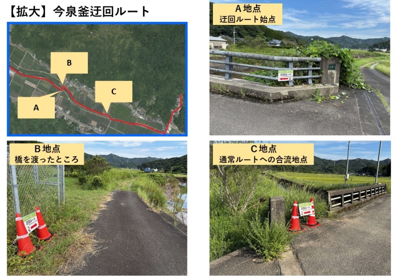 豪雨による土砂崩れの影響で、千巌山付近の通行が不可となっており、現在も復旧作業が続いています。安全確保のため、当面の間、以下の迂回路をご利用ください。