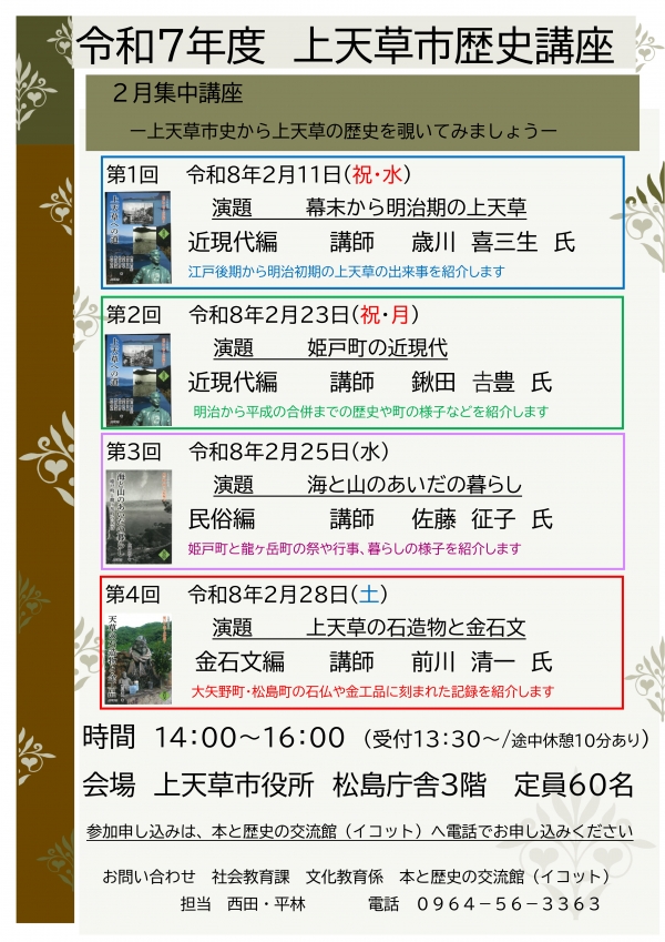 令和7年度上天草市歴史講座は、2月集中講座といたしまして上天草市史姫戸町・龍ヶ岳編の「近現代編」「民俗編」「金石文編」それぞれの著者を講師にお招きし、各編の主な内容や調査による新発見などについてわかりやすく解説いただきます。