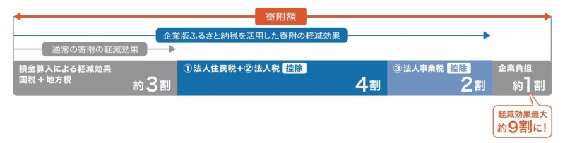 具体的には、国が認定した地方公共団体が行うプロジェクトに対し企業が寄附を行った場合に、法人関係税から税額控除する仕組みで、損金算入による軽減効果(寄附額の約3割)と合わせて、2020年度税制改正により拡充された税額控除(寄附額の最大6割)により、最大で寄附額の約9割が軽減され、実質的な企業の負担が約1割まで圧縮されます。