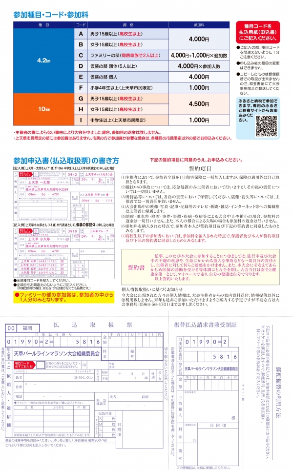 大会要項(パンフレット)に備え付けの払込取扱票に必要事項を記入し、郵便局(ゆうちょ銀行)窓口で参加料をお振り込みください。