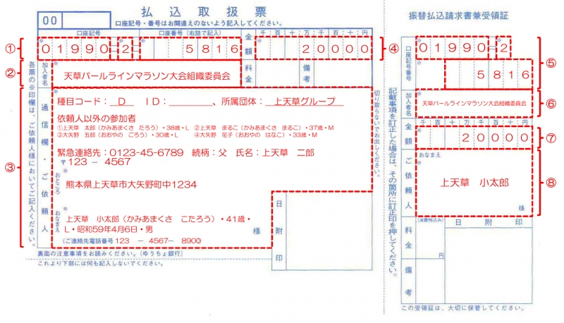 | 1.口座記号に【01990 2】、口座番号に【5816】を記入。 2.加入者名に【天草パールラインマラソン大会組織委員会】を記入。 3.通信欄に【種目コード】【ID(過去大会に参加された方のみ)】【所属団体】【緊急連絡先】【続柄】【氏名】を記入。 ※ファミリーの部又は仮装の部団体にエントリーされる方は、ご依頼人(代表者)以外の参加者情報【氏名(ふりがな)】【年齢】【Tシャツサイズ(仮装の部団体のみ)】も記入。 ご依頼人欄にご依頼人(代表者)の【郵便番号】【おところ】【おなまえ(氏名・ふりがな・年齢・Tシャツサイズ・生年月日・性別】を記入。 ご連絡先電話番号を記入。 4.参加料を記入。 ※ファミリーの部は、代表者4,000円+1,000円×追加申込数です。(4人家族の場合4,000円+1,000円×3人) ※仮装の部はおひとり4,000円です。(5人の場合4,000円×5人) 5.「1」と同じように記入。 6.「2」と同じように記入。 7.「4」と同じように記入。 8.ご依頼人の名前のみを記入。 |