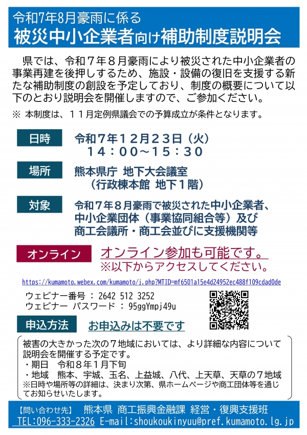 熊本県では、令和7年8月豪雨により被災された中小企業者の事業再建を後押しするため、施設・設備の復旧を支援する新たな補助制度の創設を予定しており、制度の概要について以下のとおり説明会を開催しますので、ご参加ください。