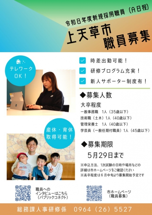 ・詳細はこちら→令和8年度上天草市職員採用試験(A日程:一般事務職、技術職(土木)、管理栄養士)実施要領(PDF 約236KB)