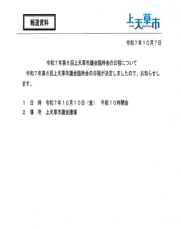 【報道資料】令和7年第6回上天草市議会臨時会の日程について