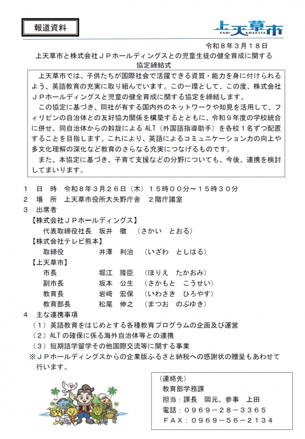 【報道資料】上天草市と株式会社JPホールディングスとの児童生徒の健全育成に関する協定締結式