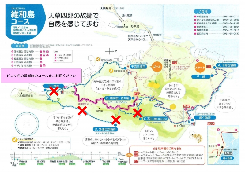 現在、大雨の影響により、高山付近の通過が通行不可となっております。 そのため、維和桜・花公園から下山地区までは、「満潮時のコース」のご利用をお願いいたします。