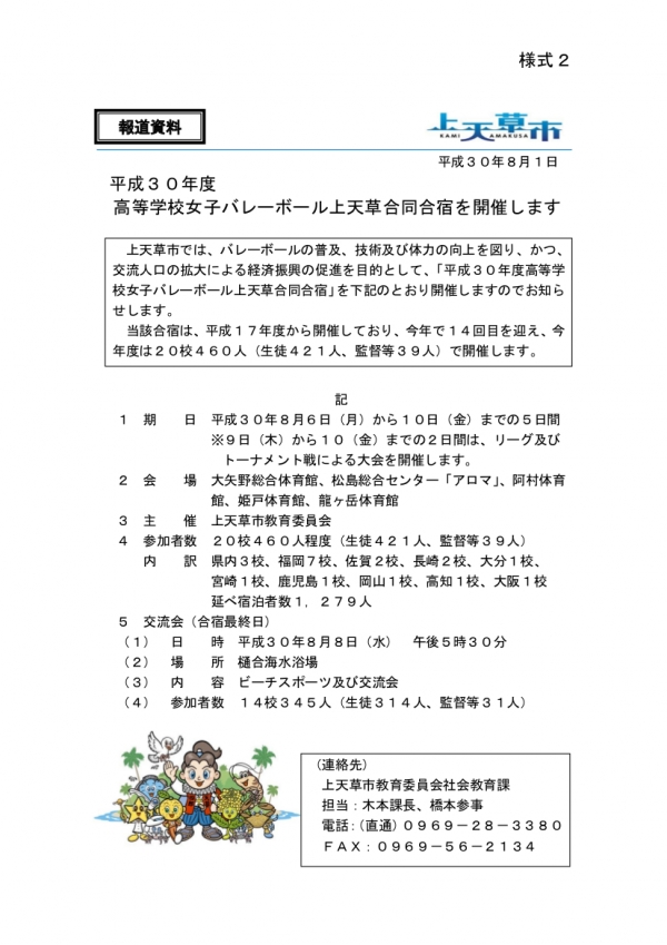 【報道資料】平成30年度高等学校女子バレーボール上天草合宿を開催します