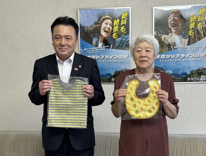 10月9日(木曜日)、大矢野町で主に子供服を作られているD&F(島田美惠子代表)から、上天草市の赤ちゃんのために、スタイ(授乳用スタイ)、Tシャツ、ズボンを寄贈していただきました。