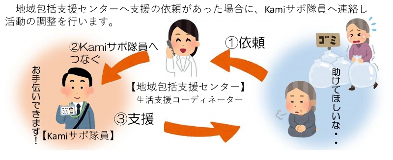 地域包括支援センターへご相談ください。支援内容に応じて、Kamiサポ隊員へお繋ぎします。