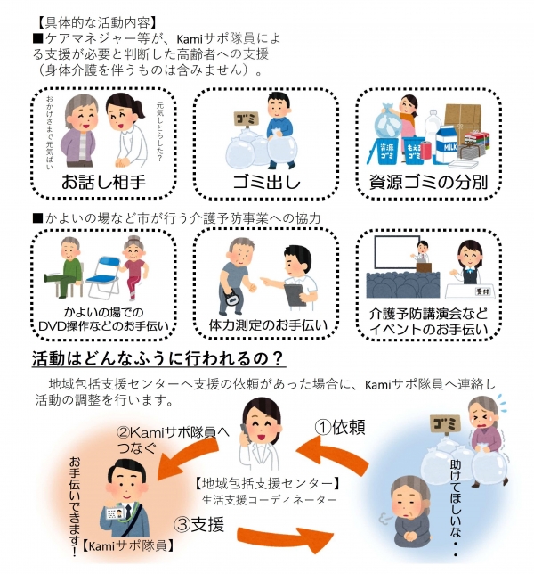 高齢者が生活するうえで困るゴミ出しや電球の交換などの「ちょっとした困りごと」へのお手伝いや、かよいの場の運営のお手伝いをするボランティアを養成し、支え合いのあるいきいきとした地域社会を作ることを目的に生活支援・介護予防サポーター(Kamiサポ隊員)養成講座を開催します。